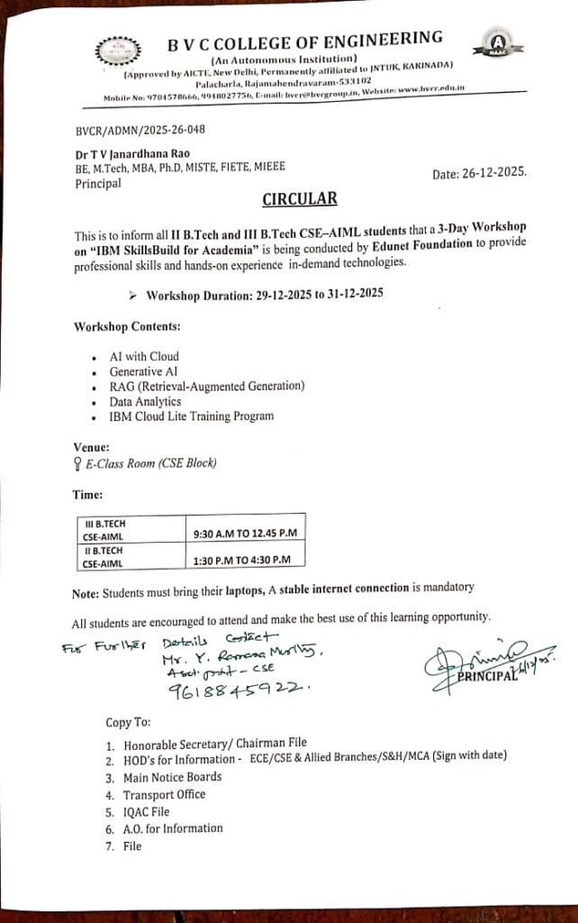 A 3 Day Workshop on “IBM Skills Build for Academia” conducted by Edunet Foundation on 29-12-25 to 31-12-25.