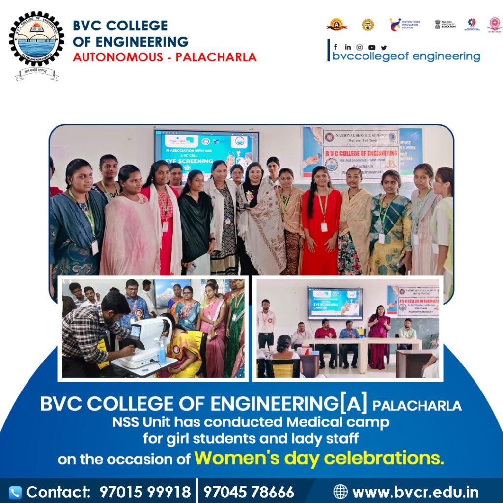 BVC College of Engineering, Palacharla NSS Unit organized a Medical Camp with Max Vision Eye Super Speciality Hospital and Palacharla PHC for Women’s Day. Free eye screening, BP, and sugar tests were conducted.