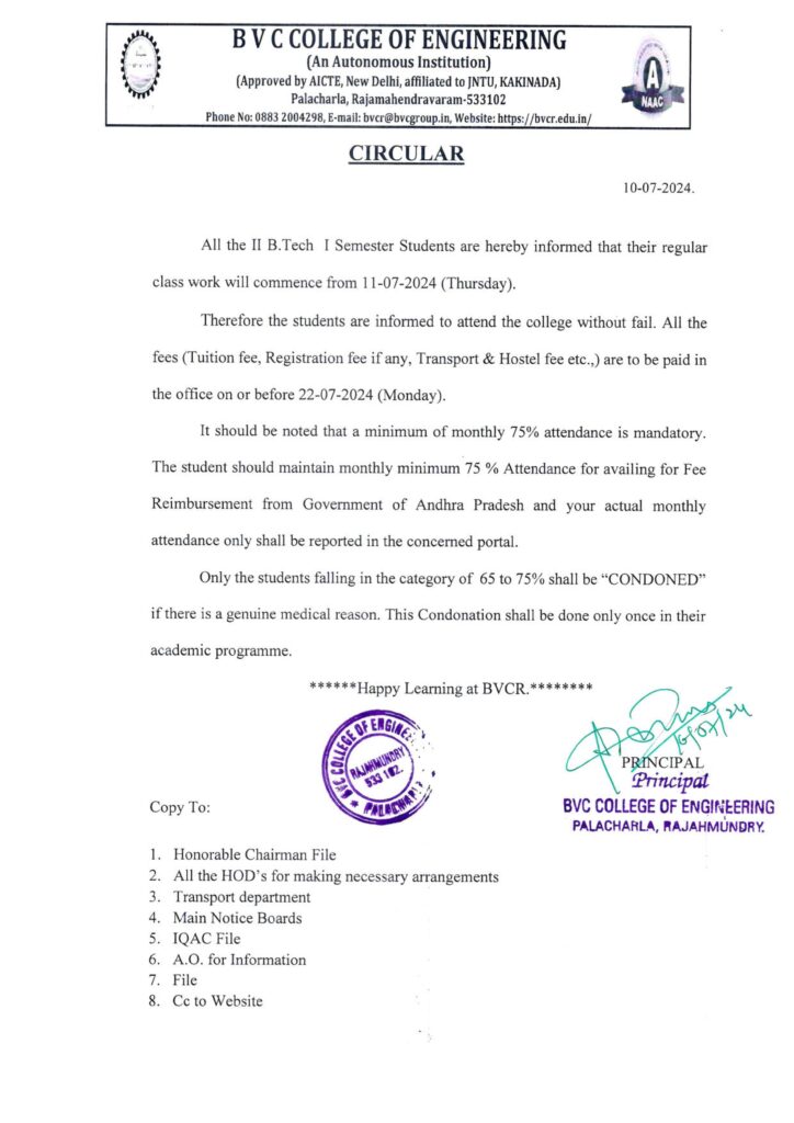 Circular for II.B.tech I Semester Classwork Date & Tution Fee,Bus fee etc. NEWSUncategorized Circular for II.B.tech I Semester Classwork Date & Tution Fee,Bus fee etc. BVCR EDITOR Jul 10, 2024 0 comments Congratulations to NPTEL SPOC Sri.R.N.V.Vishnu Murthy for Achieving this award Happy Birthday to our beloved Secretary & Correspondent Sri.Bonam Kanakayya Garu Related Posts IV SEM MCA MID-1 TIMETABLE FEB-2026 Feb 20, 2026 III-B.TECH-II SEM-REG-SUPPLE-EXAM FEE NOTIFICATION-APR-2026 Feb 20, 2026 II-B.TECH-II SEM-REG-SUPPLE-EXAM FEE NOTIFICATION-APRIL-2026 Feb 20, 2026 3-1 Supple Exams :Last Date to apply for Recounting/Revaluation/Challenge Revaluation is : 24-02-2026 Feb 19, 2026 2-1 supple Exams:Last Date to apply for Recounting/Revaluation/Challenge Revaluation is : 21-02-2026 Feb 19, 2026