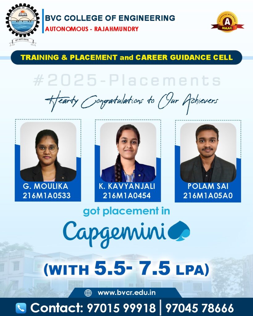 Hearty congratulations to BVCIANS who got placed in CAPGEMINI (Service now) with 5.5 to 7.5 LPA