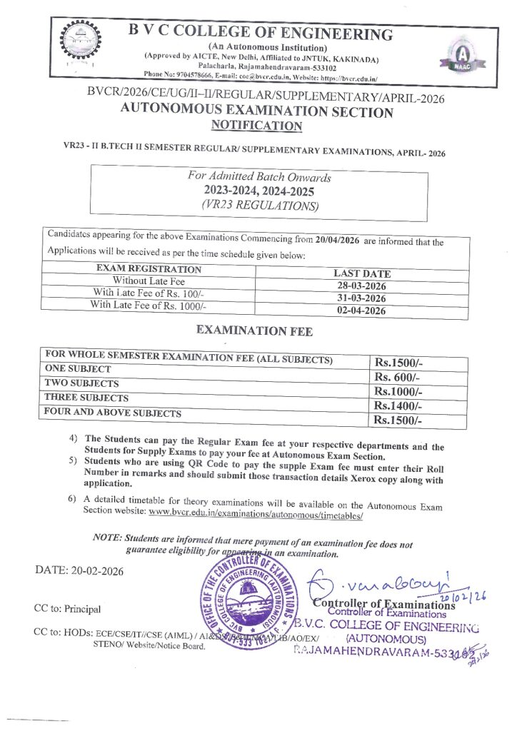 II-B.TECH-II SEM-REG-SUPPLE-EXAM FEE NOTIFICATION-APRIL-2026 marqueeNEWS II-B.TECH-II SEM-REG-SUPPLE-EXAM FEE NOTIFICATION-APRIL-2026 aicte@bvcr.edu.in Feb 20, 2026 0 comments 3-1 Supple Exams :Last Date to apply for Recounting/Revaluation/Challenge Revaluation is : 24-02-2026 III-B.TECH-II SEM-REG-SUPPLE-EXAM FEE NOTIFICATION-APR-2026 Related Posts IV SEM MCA MID-1 TIMETABLE FEB-2026 Feb 20, 2026 III-B.TECH-II SEM-REG-SUPPLE-EXAM FEE NOTIFICATION-APR-2026 Feb 20, 2026 3-1 Supple Exams :Last Date to apply for Recounting/Revaluation/Challenge Revaluation is : 24-02-2026 Feb 19, 2026 2-1 supple Exams:Last Date to apply for Recounting/Revaluation/Challenge Revaluation is : 21-02-2026 Feb 19, 2026 Results of II B.Tech I Semester (R16/R19/R20/R23) Regular/Supplementary Examinations, Nov-2025 Feb 17, 2026