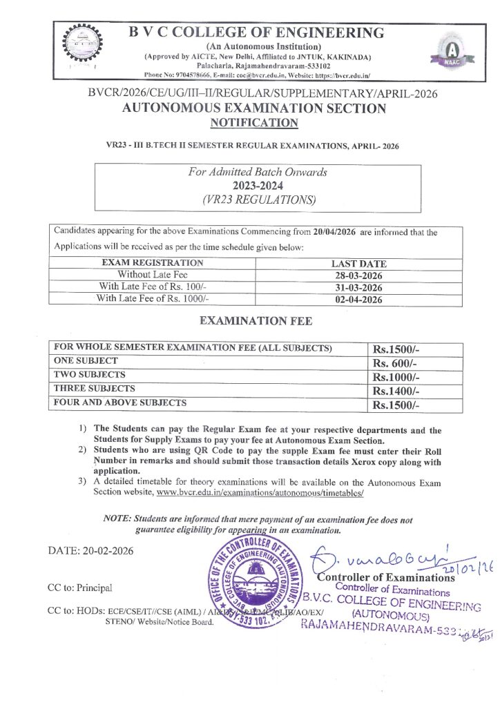 III-B.TECH-II SEM-REG-SUPPLE-EXAM FEE NOTIFICATION-APR-2026 marqueeNEWS III-B.TECH-II SEM-REG-SUPPLE-EXAM FEE NOTIFICATION-APR-2026 aicte@bvcr.edu.in Feb 20, 2026 0 comments II-B.TECH-II SEM-REG-SUPPLE-EXAM FEE NOTIFICATION-APRIL-2026 IV SEM MCA MID-1 TIMETABLE FEB-2026 Related Posts IV SEM MCA MID-1 TIMETABLE FEB-2026 Feb 20, 2026 II-B.TECH-II SEM-REG-SUPPLE-EXAM FEE NOTIFICATION-APRIL-2026 Feb 20, 2026 3-1 Supple Exams :Last Date to apply for Recounting/Revaluation/Challenge Revaluation is : 24-02-2026 Feb 19, 2026 2-1 supple Exams:Last Date to apply for Recounting/Revaluation/Challenge Revaluation is : 21-02-2026 Feb 19, 2026 Results of II B.Tech I Semester (R16/R19/R20/R23) Regular/Supplementary Examinations, Nov-2025 Feb 17, 2026